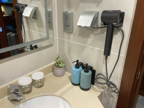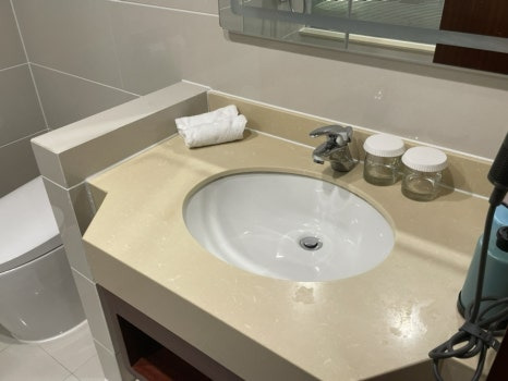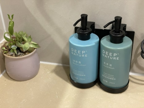 세면대 위에 바디로션과 핸드솝 디스펜서가 보이고